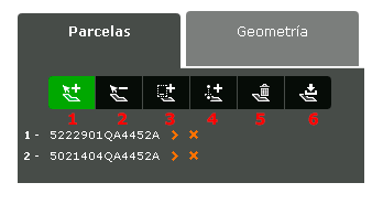 Hay dos formas de hacer la selección de parcelas, una principalmente orientada a la selección parcela a parcela, que muestra la lista de identificadores de las seleccionadas. También se permiten pequeñas selecciones por geometría.